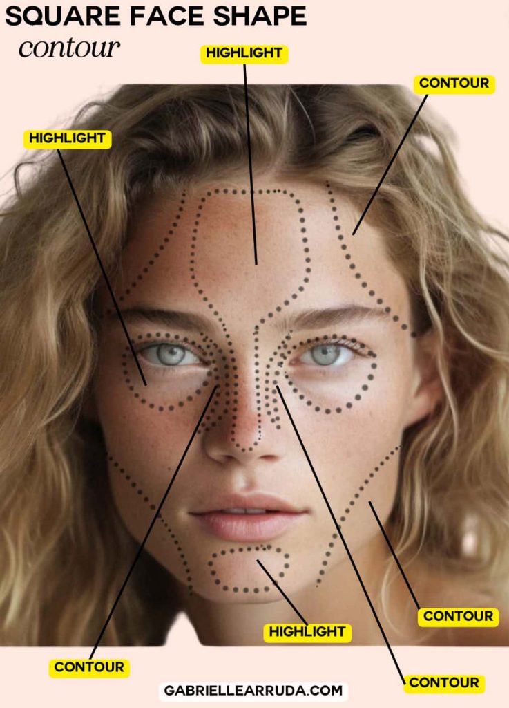 Square Soften the jawline with contouring along the sides and highlight the forehead.